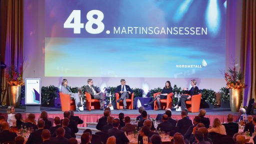 Es ist das alljährliche „soziale Lagerfeuer“ von NORDMETALL – so begrüßte Präsident Folkmar Ukena rund 450 Gäste aus Mitgliedsunternehmen, Politik, Gewerkschaften, Verbänden, Justiz, Medien und Gesellschaft zum 48. Martinsgansessen im Grand Hotel Elysée in Hamburg.