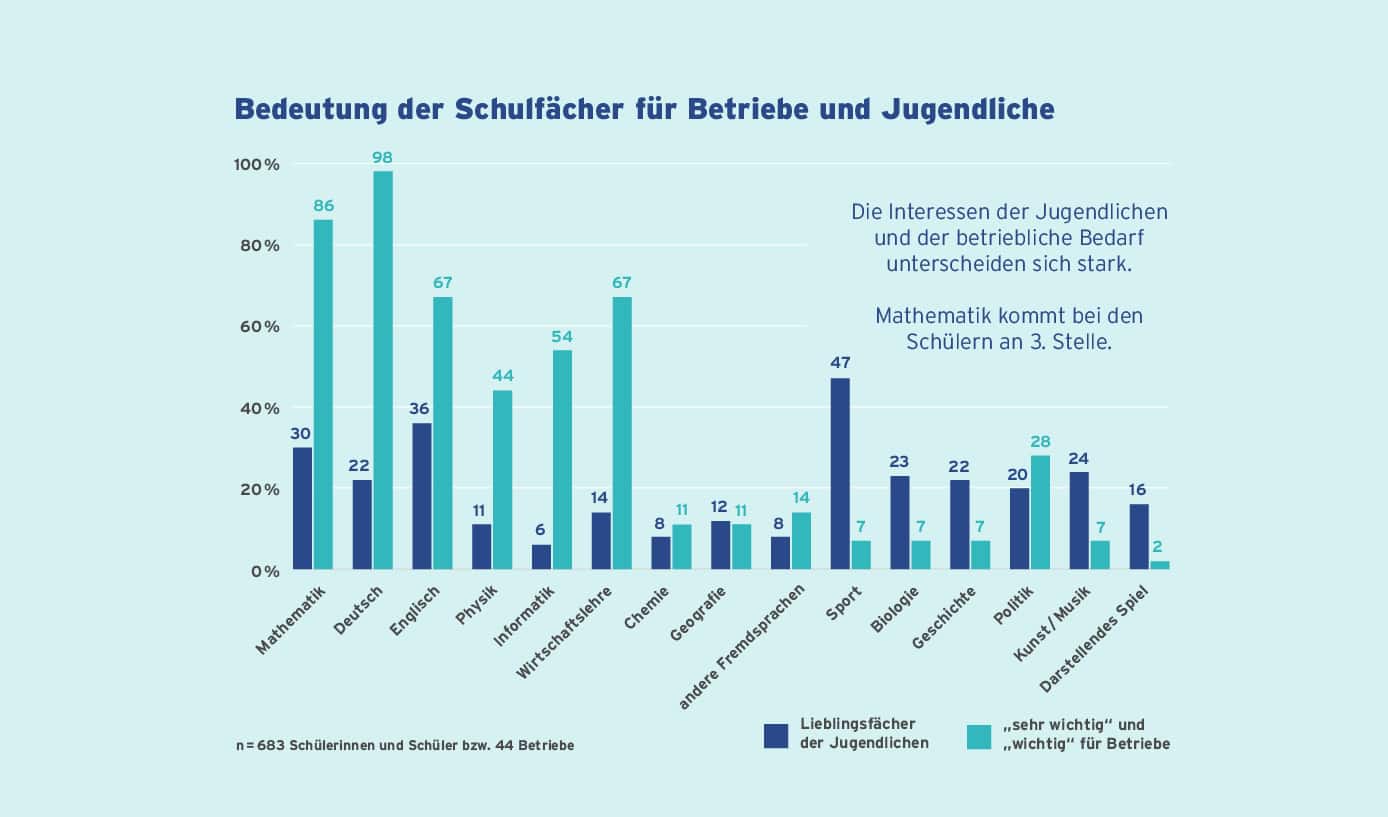 Die Jugendlichen schätzen Mathematik (30 Prozent), Englisch (36 Prozent) und Deutsch (22 Prozent) als Schulfächer weit weniger als die Betriebe, von denen 86, 67 und 98 Prozent diese Fächer für wichtig oder sehr wichtig halten – für das Fach Deutsch besteht hier ein eklatanter Bewertungsunterschied, wie er noch in keinem bisher untersuchten norddeutschen Bundesland deutlich wurde. Auch die betrieblich wichtigen Fächer Wirtschaftslehre, Physik und Informatik stießen bei den Schülerinnen und Schülern mit 14, elf und sechs Prozent auf weit geringeres Interesse als bei den Arbeitgebern (67, 44 und 54 Prozent).