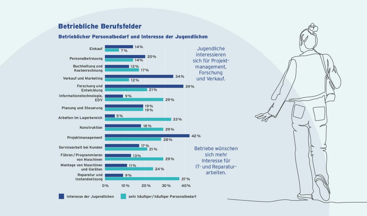 Nach der Schule steht das Studium an einer Hochschule bei 40 Prozent der befragten Jugendlichen an erster Stelle. 20 Prozent wollen sich selbstständig machen oder ein Auslandsjahr absolvieren. 23 Prozent bevorzugen ein duales Studium. Schulpraktika (85 Prozent), die Familie (53 Prozent) sowie Social Media (44 Prozent) prägen die Berufsorientierung der Schülerinnen und Schüler. Während 43 Prozent der Jugendlichen die Berufsorientierung an ihren Schulen als gut oder sehr gut bezeichnen und 23 Prozent als mangelhaft oder ausreichend, bewerten die bremischen Arbeitgeber diese Schulangebote zu null Prozent als sehr gut, zu 26 Prozent als gut und zu 28 Prozent als mangelhaft oder ausreichend. 14 Prozent der Jugendlichen würden in der M+E-Industrie arbeiten wollen, 41 Prozent könnten sich das „vielleicht“ vorstellen, mehr als in Hamburg oder Mecklenburg-Vorpommern.