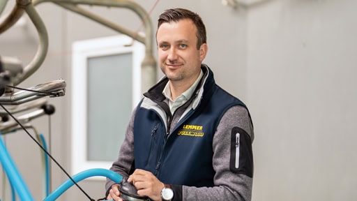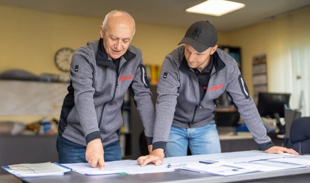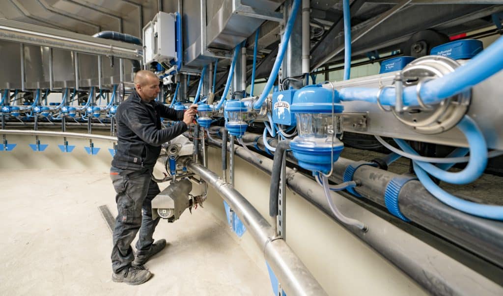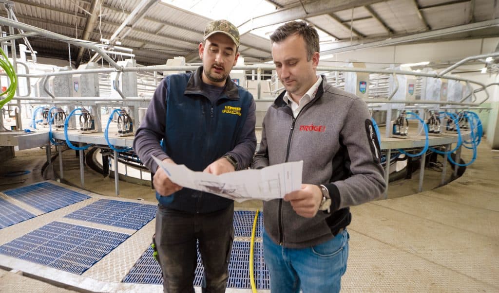 Die Autofahrt zu einer Baustelle wie in Greven, wo derzeit sieben seiner Mitarbeiter in einem Milchviehbetrieb ein neues Melkkarussell aufbauen, ist für Geschäftsführer Hardtke eher die Ausnahme. Um das operative Geschäft kümmern sich die Bereichsleiter, er selbst ist „mit strategischen Dingen sowie Personal- und Marketingfragen und dem Vertrieb“ beschäftigt. Die Tour nach Greven nutzt der Chef, um einige Bauteile, die zur Montage benötigt werden, mitzunehmen. In der Milchviehanlage übergibt er sie seinem bauleitenden Monteur Tom Bartels. Der 24-Jährige ist mit seinen Kollegen seit einigen Wochen damit beschäftigt, das neue Melkkarussell in ein vorhandenes Gebäude zu integrieren.