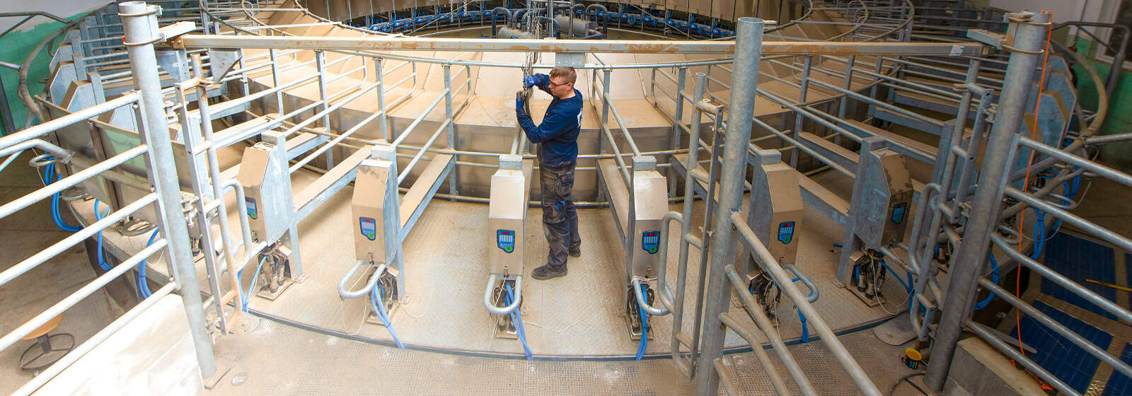 Der Bauplatz, auf dem zuvor ein stillgelegtes Melkkarussell aus DDR-Zeiten stand, erwies sich als eng bemessen. Beim Umrunden der Melkanlage verbleibt wenig Raum zwischen Wand und Stahl. Hingegen erscheint der kreisförmige Innenraum wie eine Zirkusarena. „Das Karussell ist für 52 Kühe ausgelegt, die zugleich gemolken werden können“, erzählt Bartels und zeigt auf einen der Melkstände. „Die Anlage ist ein sogenannter Außenmelker. Das heißt, die Kuh steht mit dem Kopf zum Innenkreis, und am Außenring legen zwei Melker das Melkzeug an die Tiere an.“ Pro Stunde können damit 250 bis 300 Milchkühe in dem Melkkarussell abgefertigt werden.