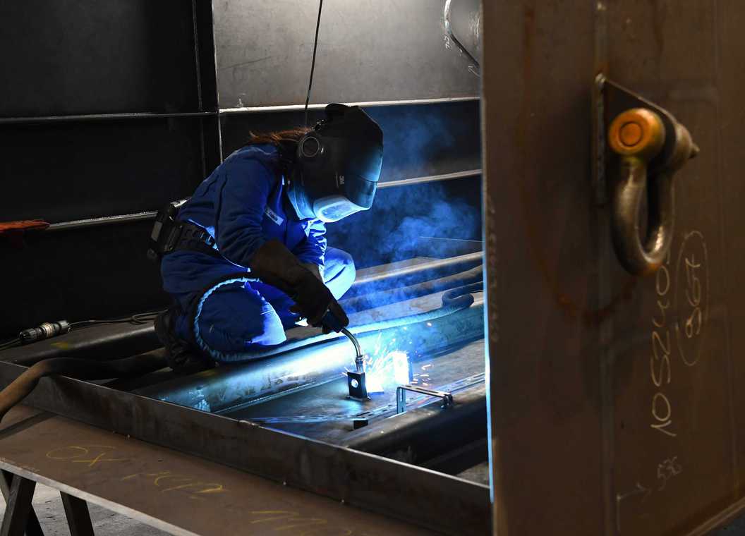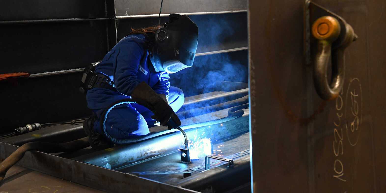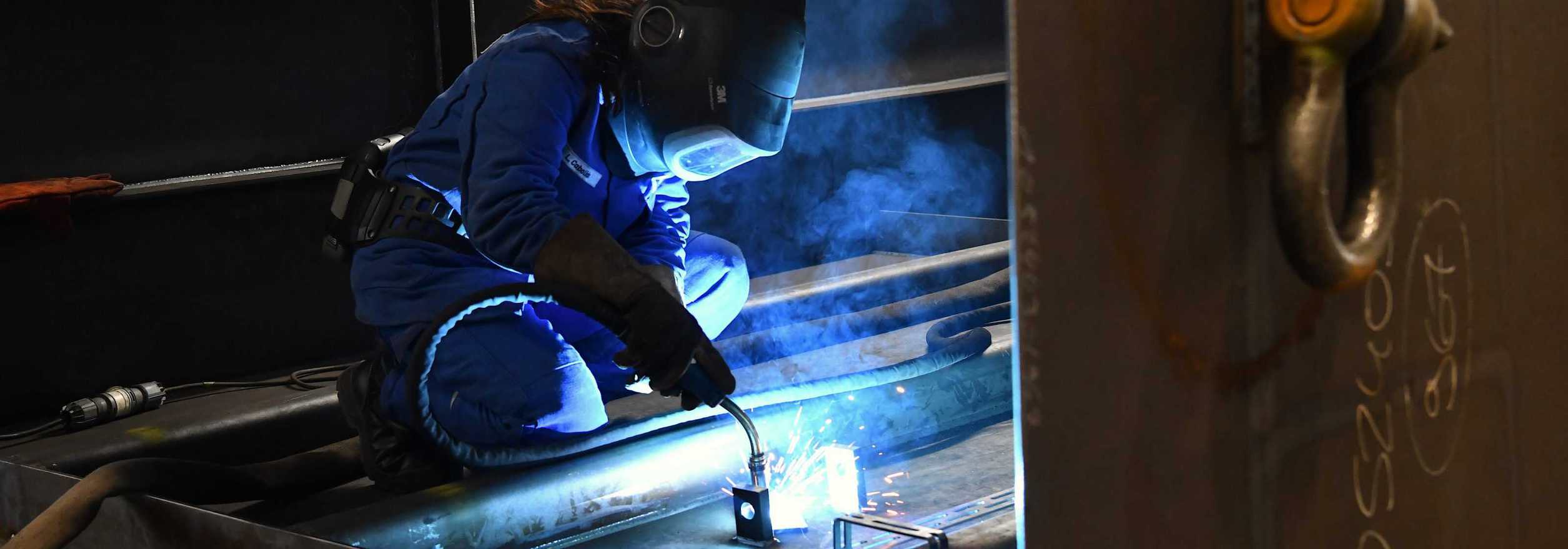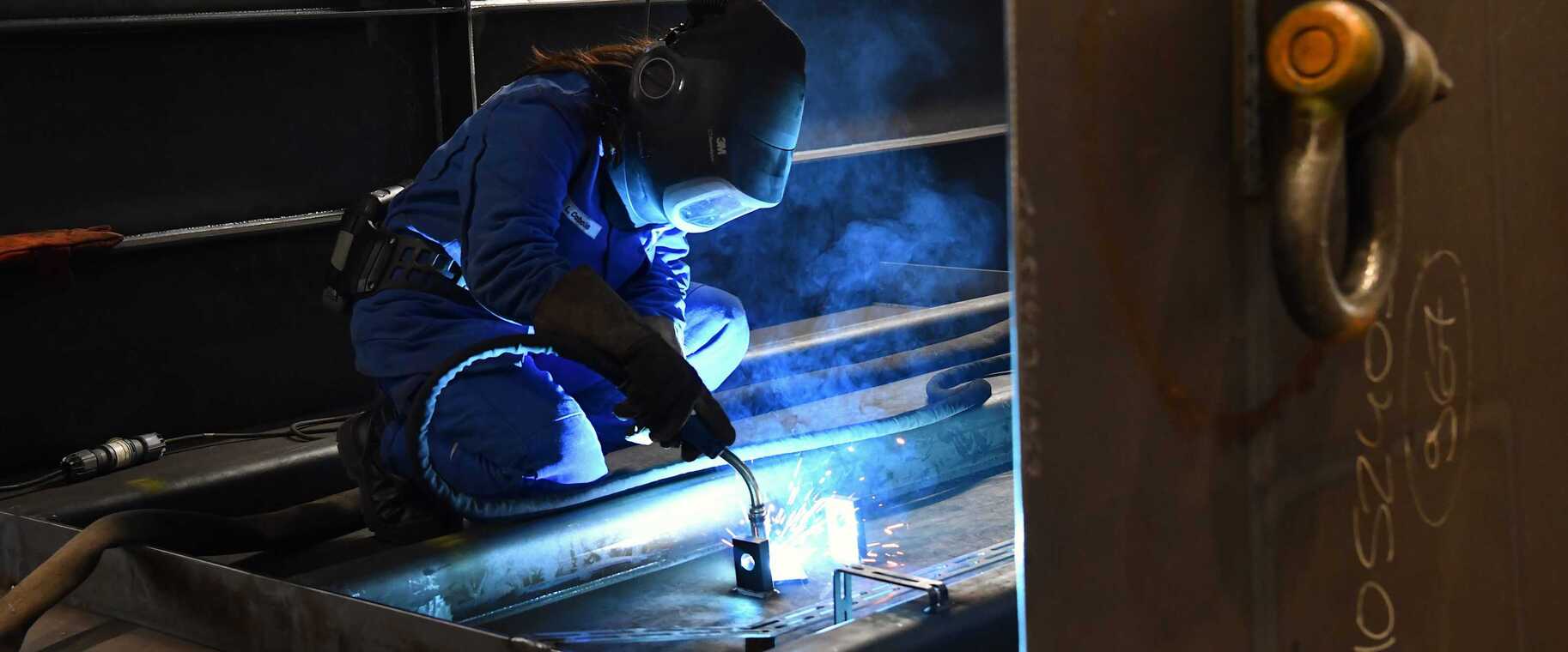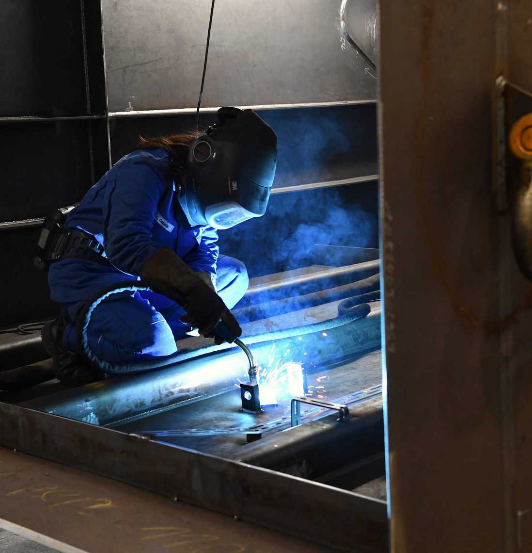 Schweißarbeiten am Mittelteil eines späteren Hafenmobilkrans von Liebherr (l.).Schweißerin Liezl Cabalida in Arbeitsmontur.