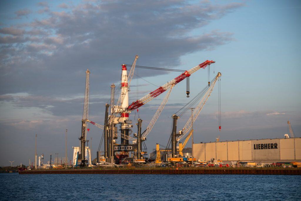 Der Produktionsstandort von Liebherr-Rostock prägt das Panorama des Industriehafens der Hansestadt.